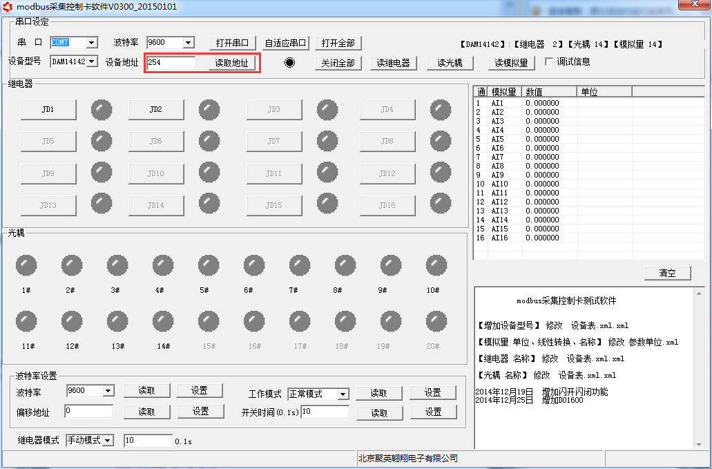 打開“聚英翱翔DAM調試軟件”;串口設定欄:串口選擇您電腦對應COM口,波特率選擇設備默認波特率(9600)(未自己設置過波特率前),設備地址填寫“254”(254為設備的廣播地址),設備型號選擇相對應型號,設置好以上設備的4個參數后點擊打開串口,點擊繼電器按鈕“JD1”若繼電器反應則連接成功。