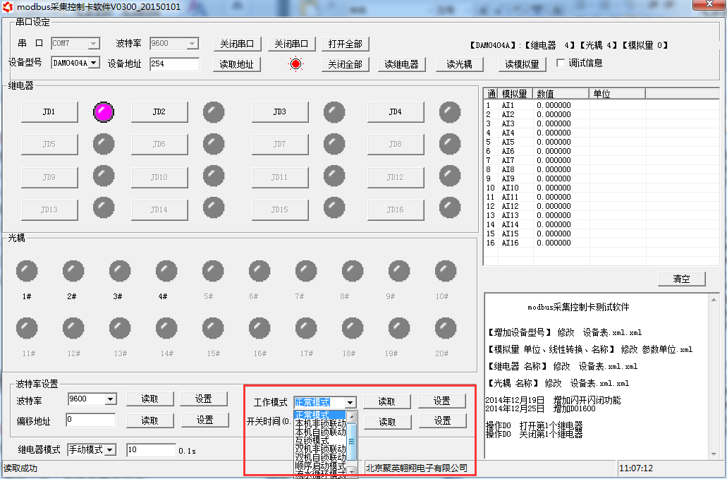 打開“聚英翱翔DAM調試軟件” 點擊下方工作模式設置欄的“讀取”和“設置”就可以分別讀取和設置工作模式。