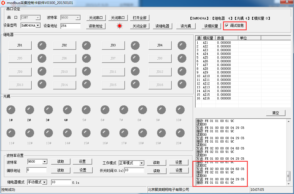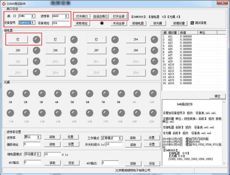 打開“聚英翱翔DAM調試軟件”;串口設定欄:串口選擇您電腦對應COM口,波特率選擇設備默認波特率(9600)(未自己設置過波特率前),設備地址填寫“254”(254為設備的廣播地址),設備型號選擇相對應型號,設置好以上設備的4個參數后點擊打開串口,點擊繼電器按鈕“JD1”若繼電器反應則連接成功。