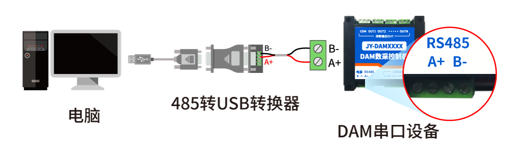 電腦自帶的串口一般是RS232,需要配232-485轉換器(工業環境建議使用有源帶隔離的轉換器),轉換后RS485為A、B兩線,A接板上A端子,B接板上B端子,485屏蔽可以接GND。若設備比較多建議采用雙絞屏蔽線,采用鏈型網絡結構。