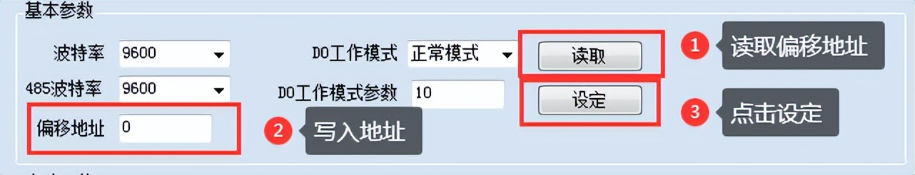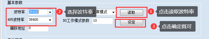 點擊下方波特率設置欄的“讀取”和“設置”就可以分別讀取和設置波特率和地址,操作后需要重啟設備和修改電腦串口設置。