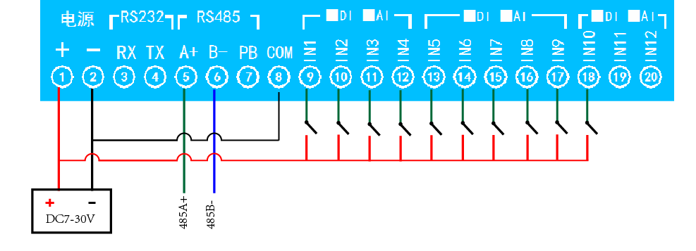 下圖中的ACOM為設(shè)備上的供電負(fù)極,AINn為設(shè)備上的IN輸入
