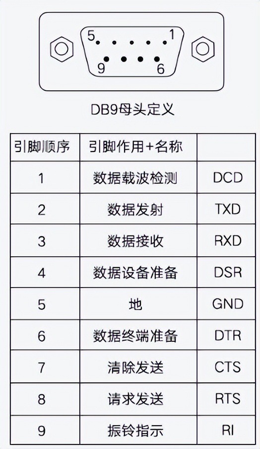 RS232接線為標準DB9母頭接口,為直連線,引腳定義如下所示: