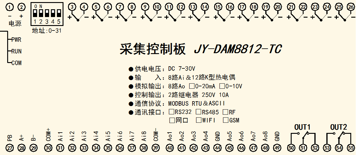 功能說明:8DO+8DI+8AI+4AO