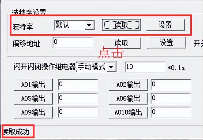 點擊下方波特率設置欄的“讀取”和“設置”就可以分別讀取和設置波特率和地址,操作后需要重啟設備和修改電腦串口設置。