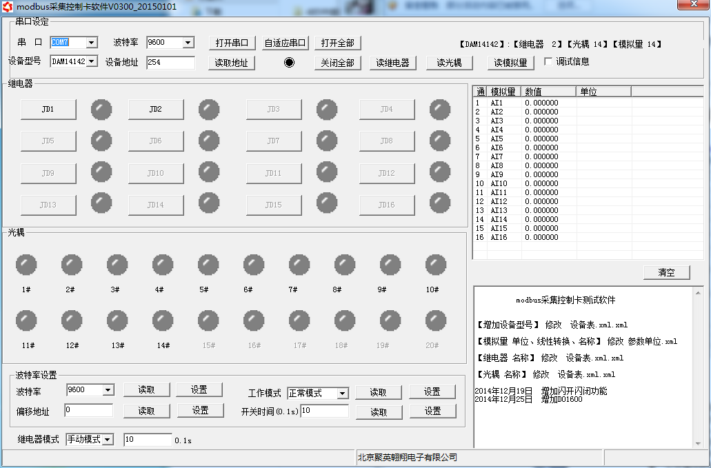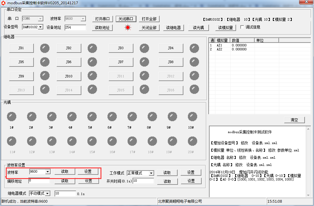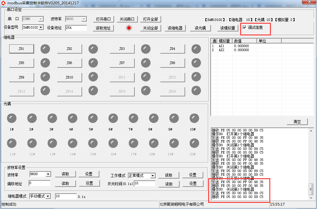 打開“聚英翱翔DAM調試軟件”;串口設定欄:串口選擇您電腦對應COM口,波特率選擇設備默認波特率(9600)(未自己設置過波特率前),設備地址填寫“254”(254為設備的廣播地址),設備型號選擇相對應型號,設置好以上設備的4個參數后點擊打開串口,點擊繼電器按鈕“JD1”若繼電器反應則連接成功。
