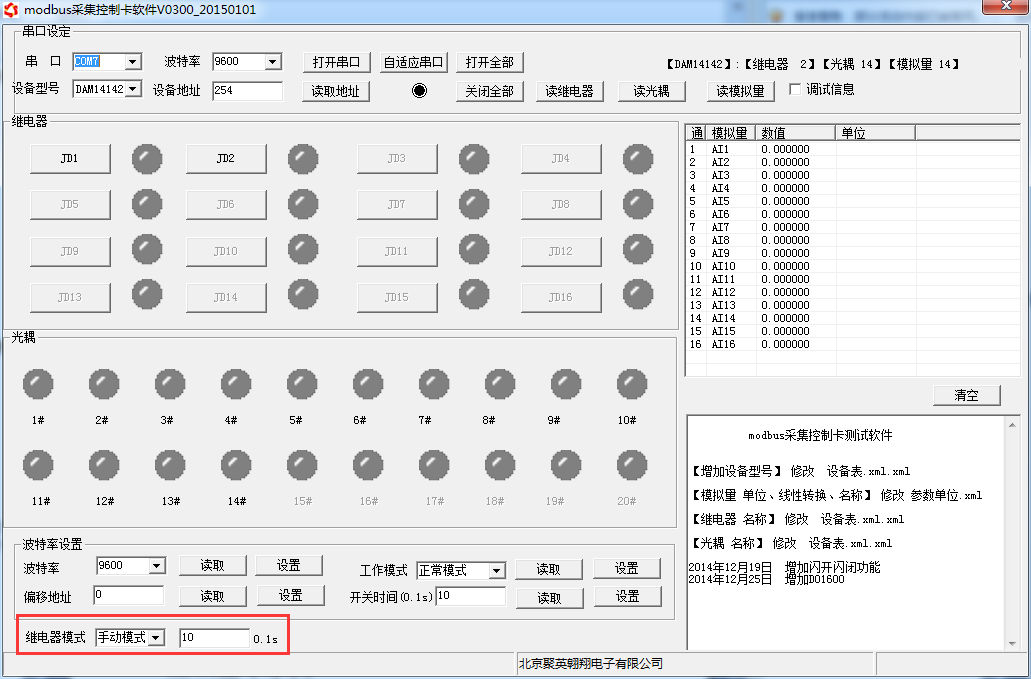 打開“聚英翱翔DAM調試軟件”點擊繼電器模式后面下拉箭頭進行模式的選擇。(后邊時間可自行設置,實際時間=填寫數字*0.1【單位秒】)