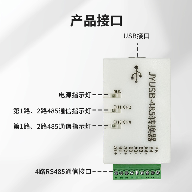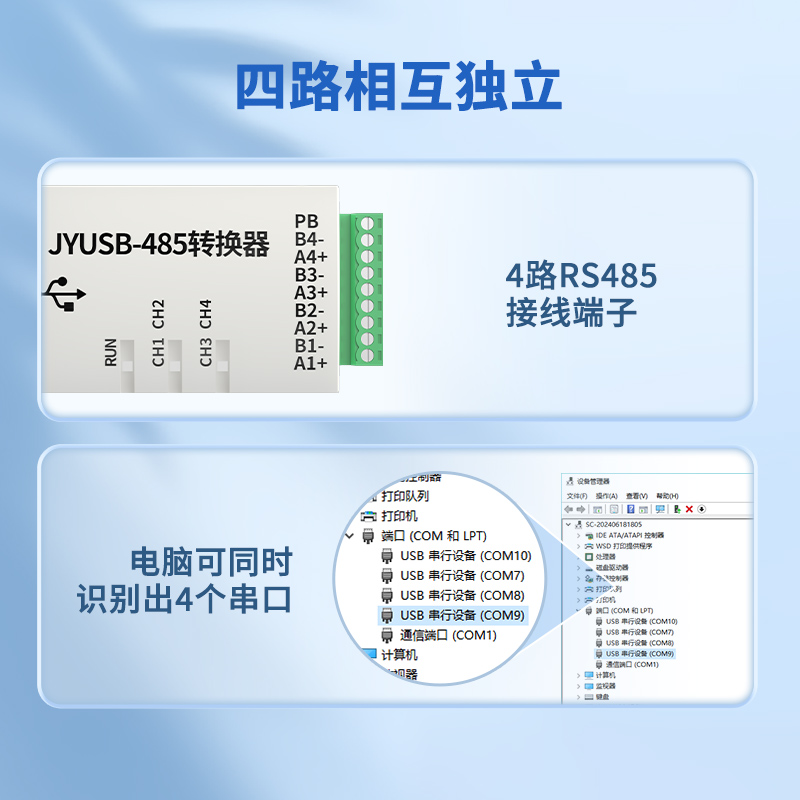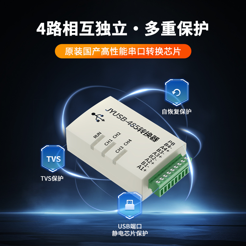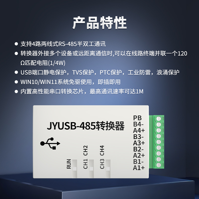 USB轉RS485轉換器,支持2/3/4路兩線式RS-485半雙工通訊轉換器,外接多個設備或遠距離通信時,可以在線路終端并聯一個120Q匹配電阻(1/4W),WIN10/WIN11系統免驅使用,即插即用,內置高性能串口轉換芯片,最高通訊速率可達1M