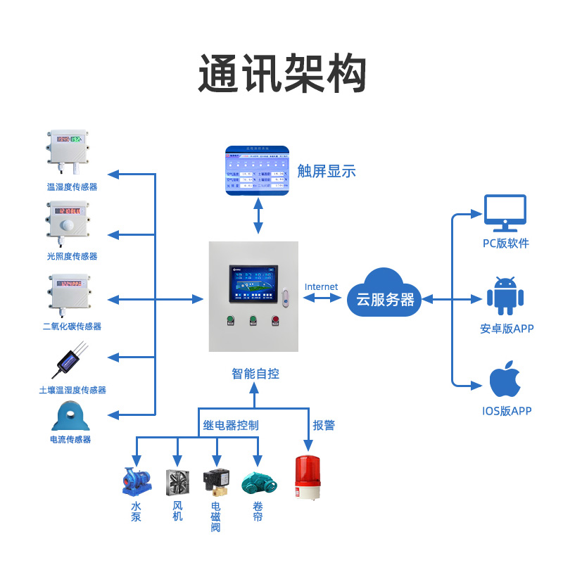 農業智能控制器是我公司云系列設備中網絡版的一種,設備通過連接Internet廣域網來進行通訊,使用我司配套的云平臺軟件可實現遠程控制設備功能,每個設備具有唯一 ID 號方便用戶進行二次開發使用。